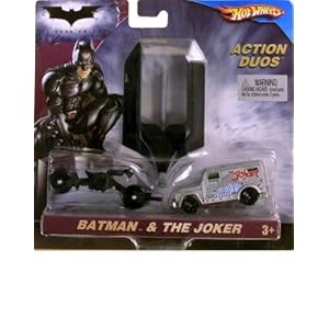 Product Description : HOT WHEELS THE DARK KNIGHT TM Scene Stealers* Assortment: Whether you choose the Batmobile TM or Bat-pod TM, these action packs let you devise the wildest stunts for Batman TM and pull them off yourself. Each one comes with a special launcher built to accommodate either vehicle so Batman TM can chase down Harvey Dent or The Joker. Designed to capture the excitement and energy of The Dark KnightTM, this assortment features a special launcher and all the accessories you need for hours of fun. Includes two vehicles and one launcher. Not for use with some Hot Wheels sets.